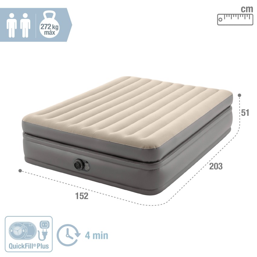 Colchón hinchable gama Dura-Beam Plus modelo Prime Comfort Elevated con medidas 152x203x51 cm y capacidad para 2 personas (máx.272 kg). Uso interior