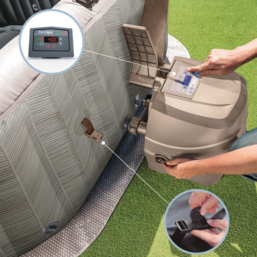 Pack ahorro: spa hinchable 4 personas + cobertor de aislamiento + tapiz térmico + asiento + soporte bebidas + dispensador químico + 2 filtros S2